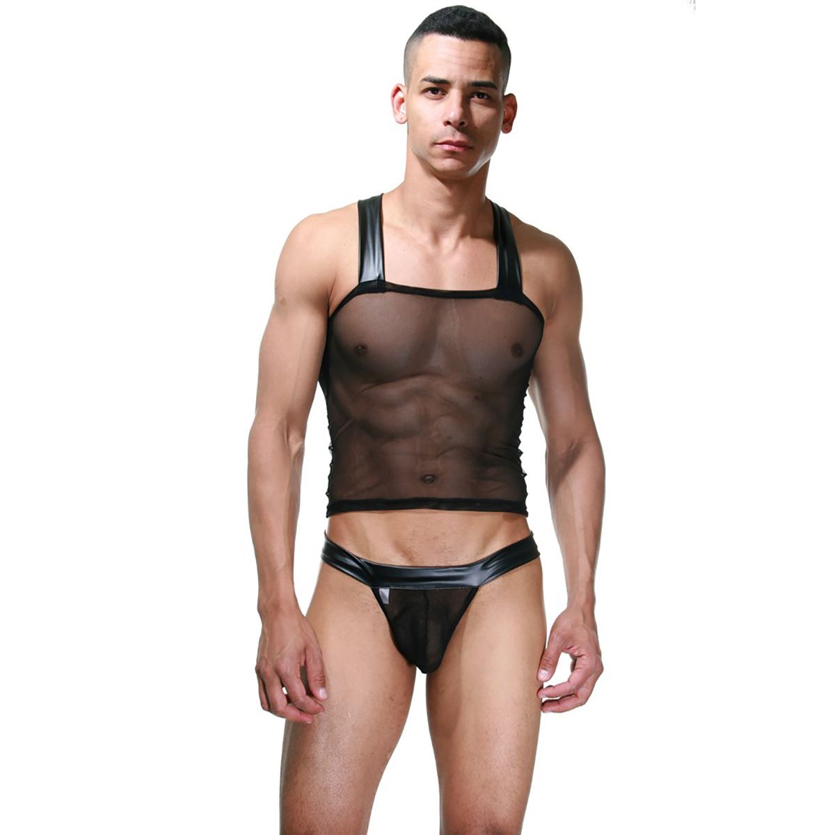 Мужской эротичный комплект. Майка костюма сделана из прозрачной и мягкой ткани, поэтому не будет доставлять дискомфорта и прекрасно подчеркнет достоинства любой фигуры. Лямки майки и трусы сделаны из блестящей ткани, поэтому полностью комплект смотрится закончено и органично. В комплекте: майка, трусы-стринги.