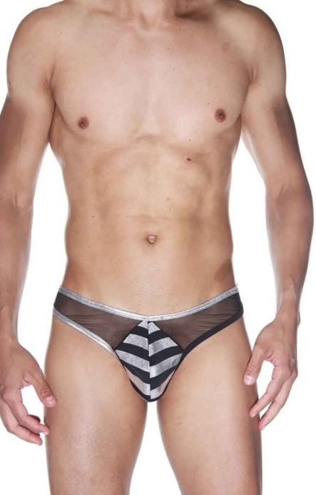 Трусы-джоки для мужчин, сделаны из комбинации двух типов ткани - полупрозрачной и гладкой в полоску. Ягодицы полностью открыты.