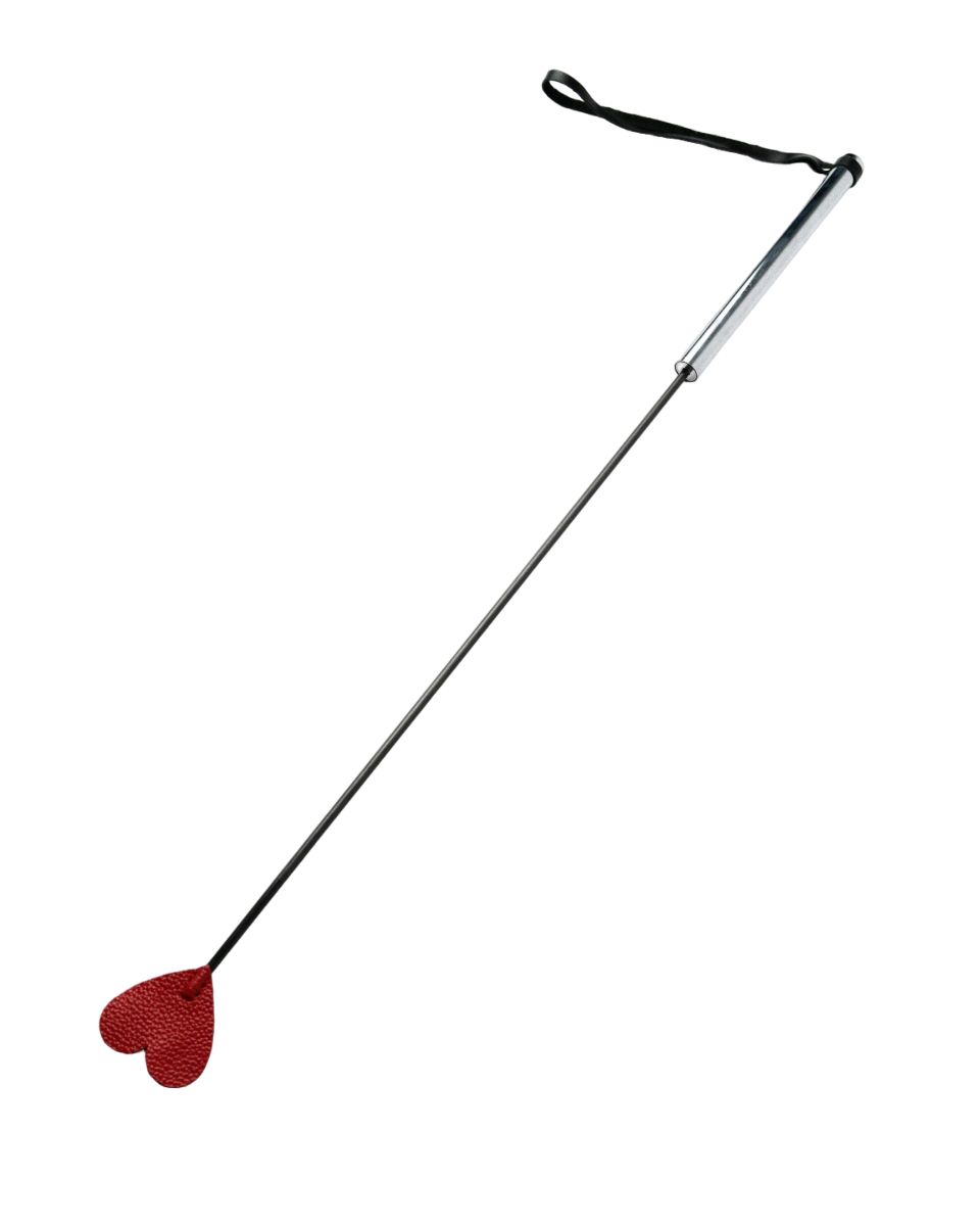 Стек с гибкой, но прочной основой. Наконечник из натуральной кожи красного цвета выполнен в форме сердца. На металлической рукояти закреплена ручка-петля для дополнительной фиксации изделия на запястье. Длина ручки - 20 см. Размеры шлепка - 7х6 см.