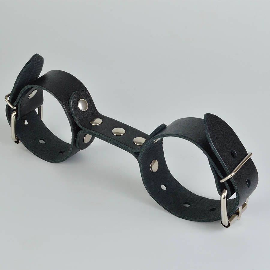 Наручники изготовлены из ременной кожи. Фурнитура никелированная. Наручники имеют кожаную перемычку, на которой зафиксированы наручники. Максимальный охват - 24 см. Ширина ремешков - 2,5 см.